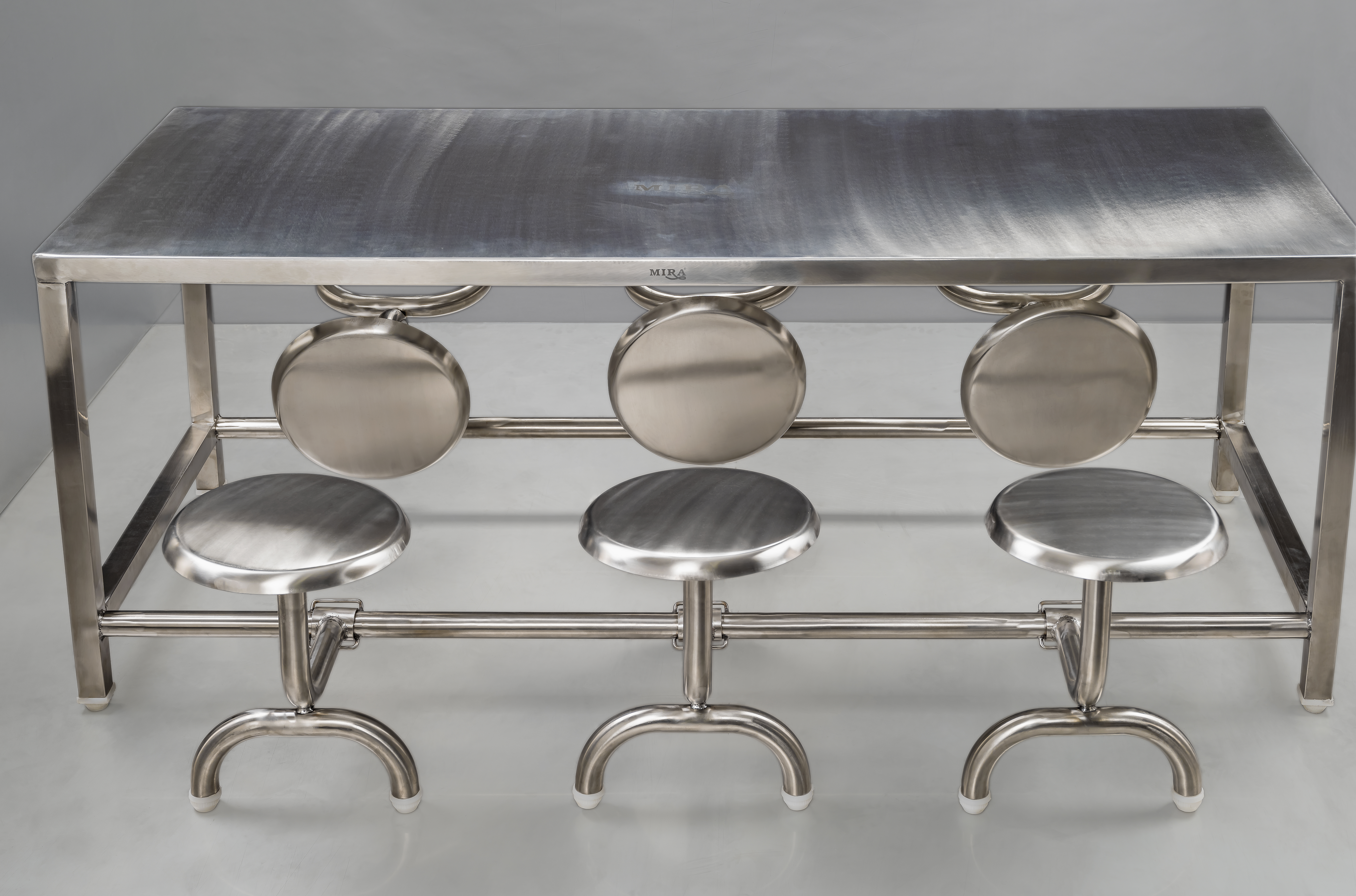 6-Seater Stainless Steel Dining Table with Fixed Chairs | طاولة طعام ستانلس ستيل مع 6 مقاعد ثابتة | Table à Manger Inox 6 Places avec Chaises Fixes | Meza ya Kula ya Chuma cha Pua Viti 6