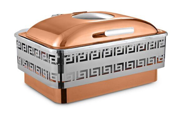 Copper Finish Cut-Through Chafing Dish – Roll Top Buffet Warmer / صحن تقديم ستانلس ستيل بلمسة نحاسية محفورة مع غطاء متدحرج / Bakır Kaplama Desenli Paslanmaz Çelik Büfe Isıtıcı / 铜质镂空不锈钢自助保温炉 – MIRA Quality