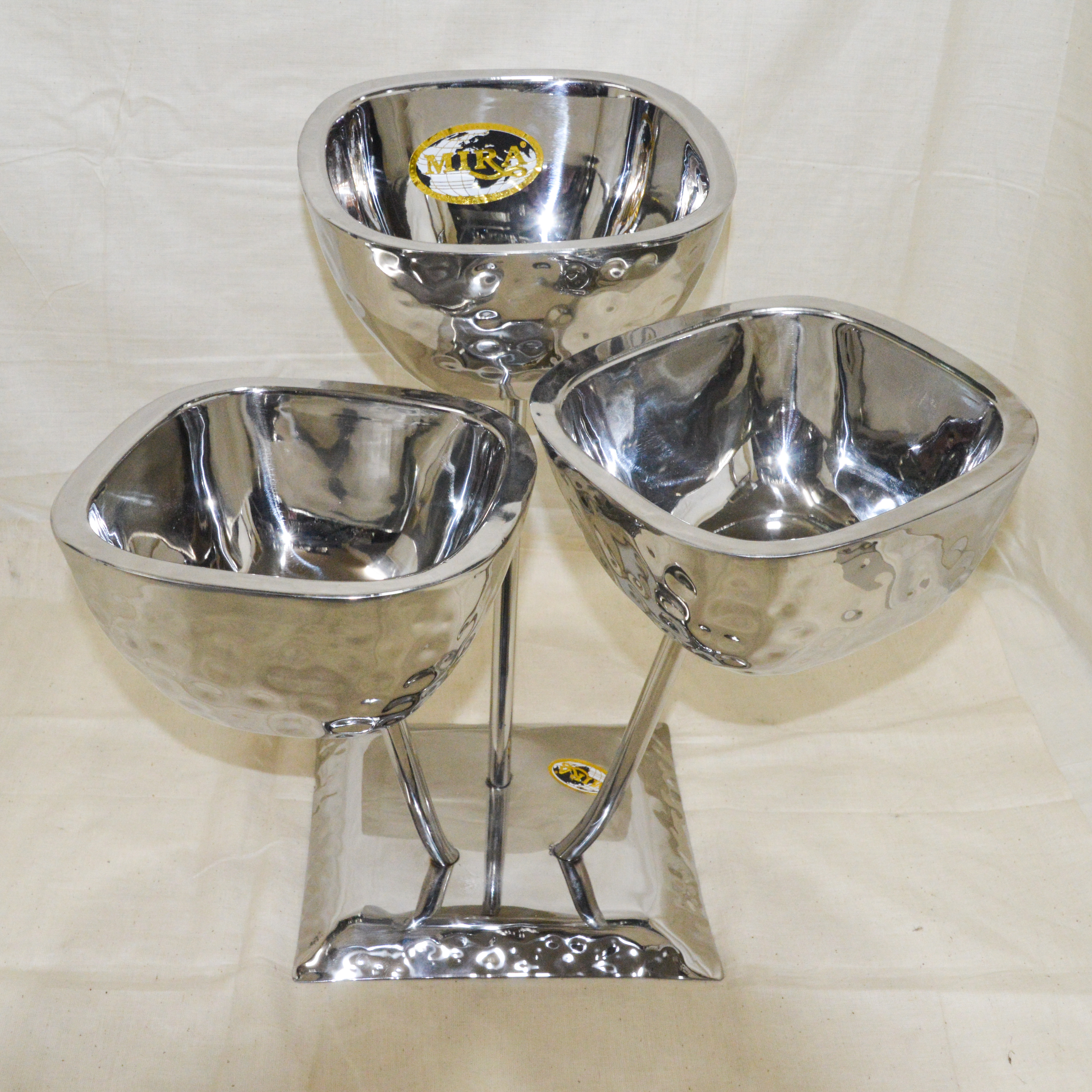 Serve and display with elegance using our Stainless Steel Hammered 3-Bowl Stand, designed for both functionality and style. Crafted from premium rust-resistant stainless steel with a beautiful hammered finish, this triple-bowl stand is perfect for serving salads, snacks, sauces, chutneys, or desserts in restaurants, hotels, catering events, and home gatherings. The elevated design ensures a stunning presentation while saving table space, making it ideal for professional and domestic use across Africa, the Middle East, and beyond.