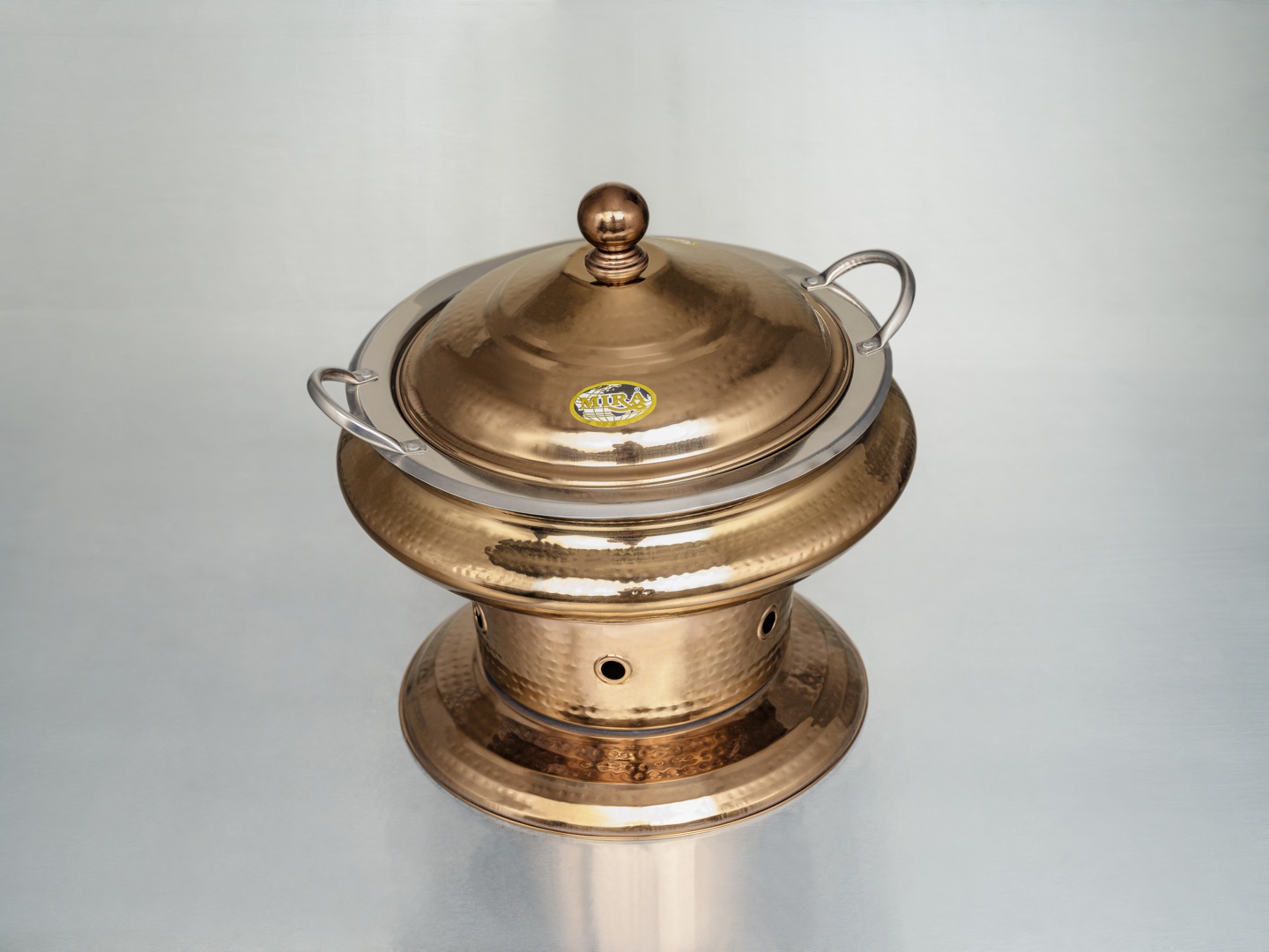 The MIRA Hammered Handi PVD Chafing Dish is an elegant buffet server designed for luxury hotels, banquets, and catering services. Crafted from premium stainless steel with a hammered PVD coating, it combines durability with a sophisticated traditional look. Its handi-style deep bowl is perfect for serving curries, biryanis, rice, and gravies while keeping them warm for long durations. Designed to complement modern and traditional dining setups, this chaffer is widely used in Africa, the Middle East, South Asia, and international hospitality markets.