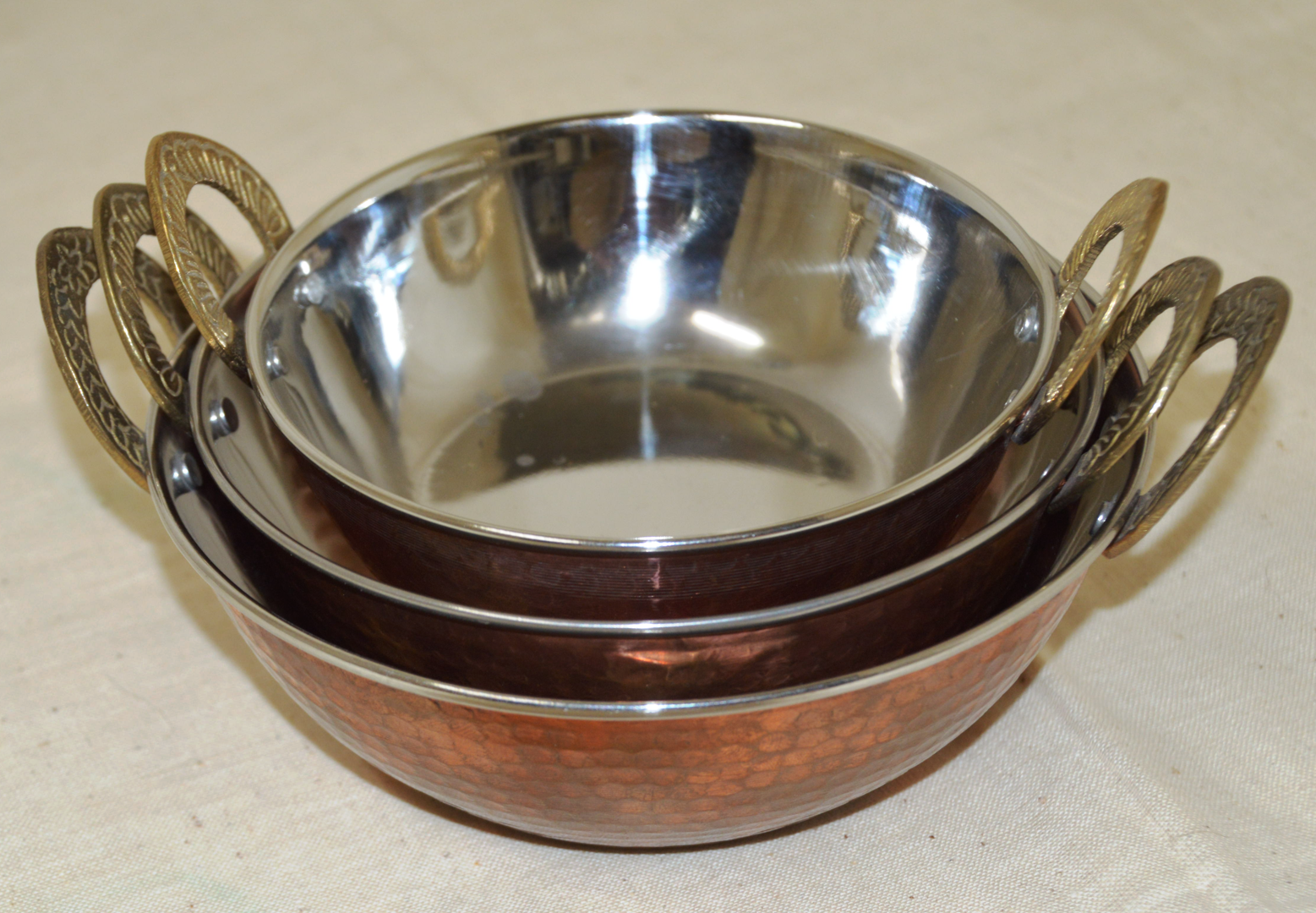 A durable, hammered stainless steel kadhai with a copper finish, perfect for cooking Indian curries and stir-fries.