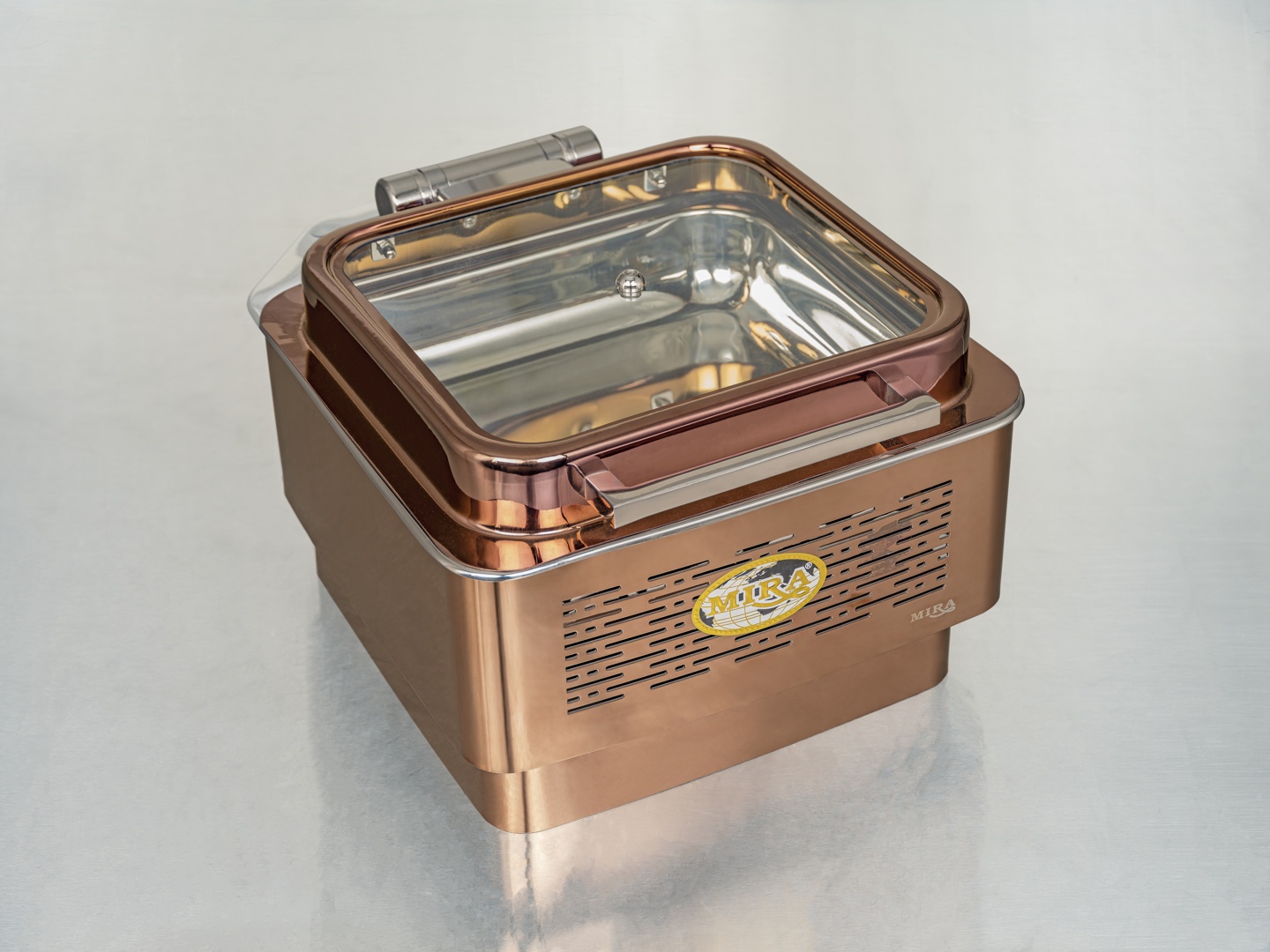 Hydraulic Full PVD Stand Chafing Dish – Roll Top Buffet Warmer / صحن تقديم هيدروليكي مطلي مع حامل / Tam Kaplamalı Hidrolik Paslanmaz Çelik Büfe Isıtıcı / 全镀层液压自助餐保温炉 – MIRA Quality