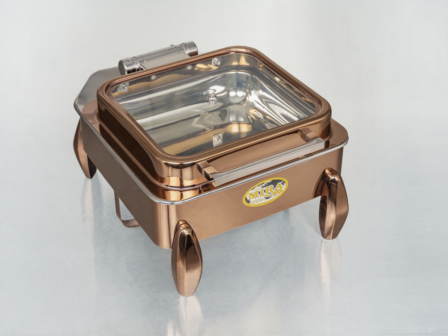 This high-quality stainless steel chafing dish features a stylish, hydraulic lid that opens smoothly and effortlessly. The PVD glass insert provides a clear view of the food while also helping to retain heat. Perfect for serving a variety of dishes at parties, weddings, and other gatherings, this chafing dish is both functional and elegant.