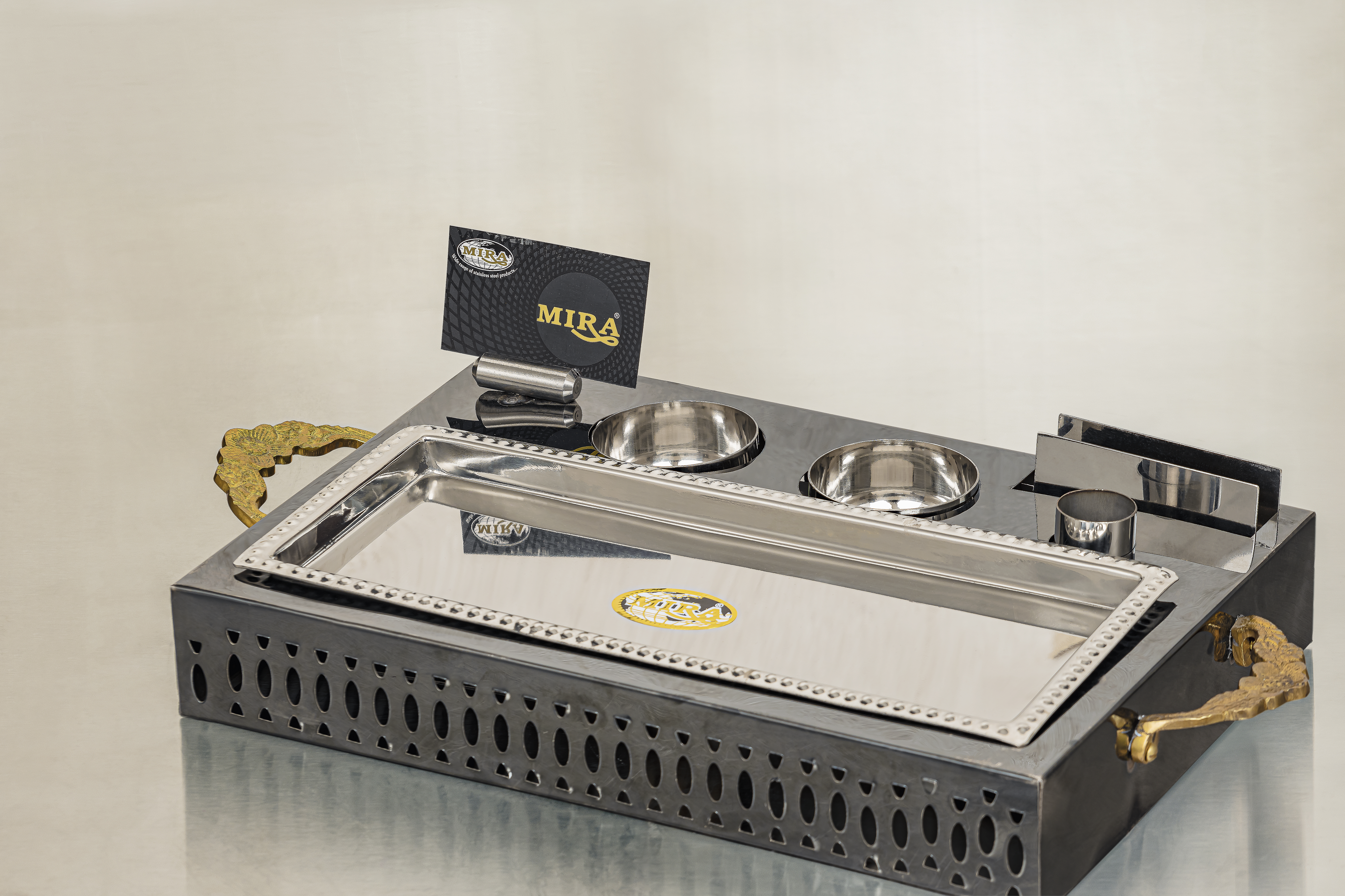 Luxury Stainless Steel Platter Set - Ornate Appetizer Tray | طقم تقديم ستانلس ستيل فاخر | Lüks Paslanmaz Çelik Servis Seti