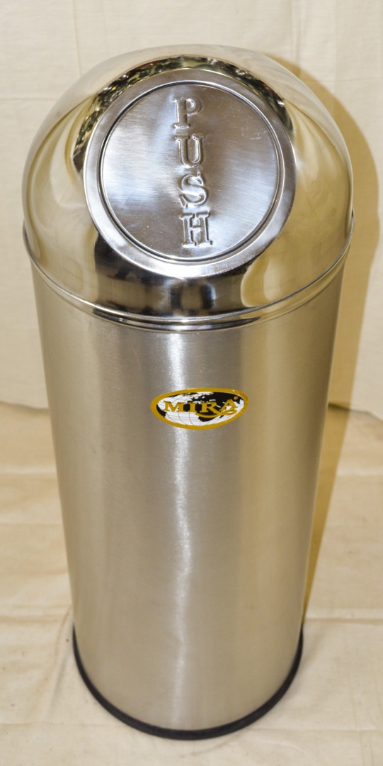 A sleek, stainless steel push can dustbin with a modern design and a hands-free lid for hygienic waste disposal.