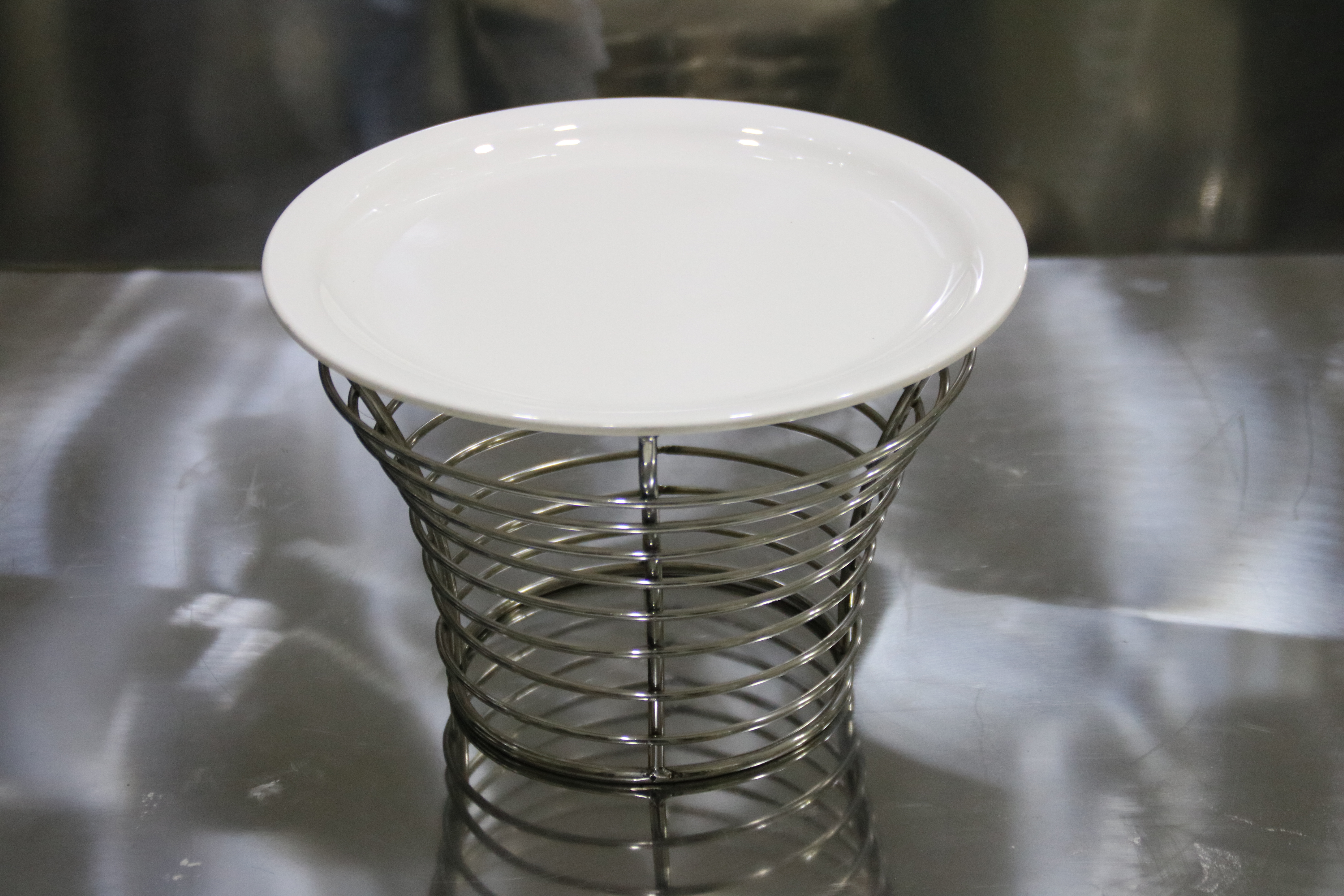 Designed for buffets, catering events, and fine dining setups, this rod stand offers both practicality and elegance. The open-wire construction enhances airflow, keeping food fresh, while the ceramic plate is easy to clean and safe for direct food contact.