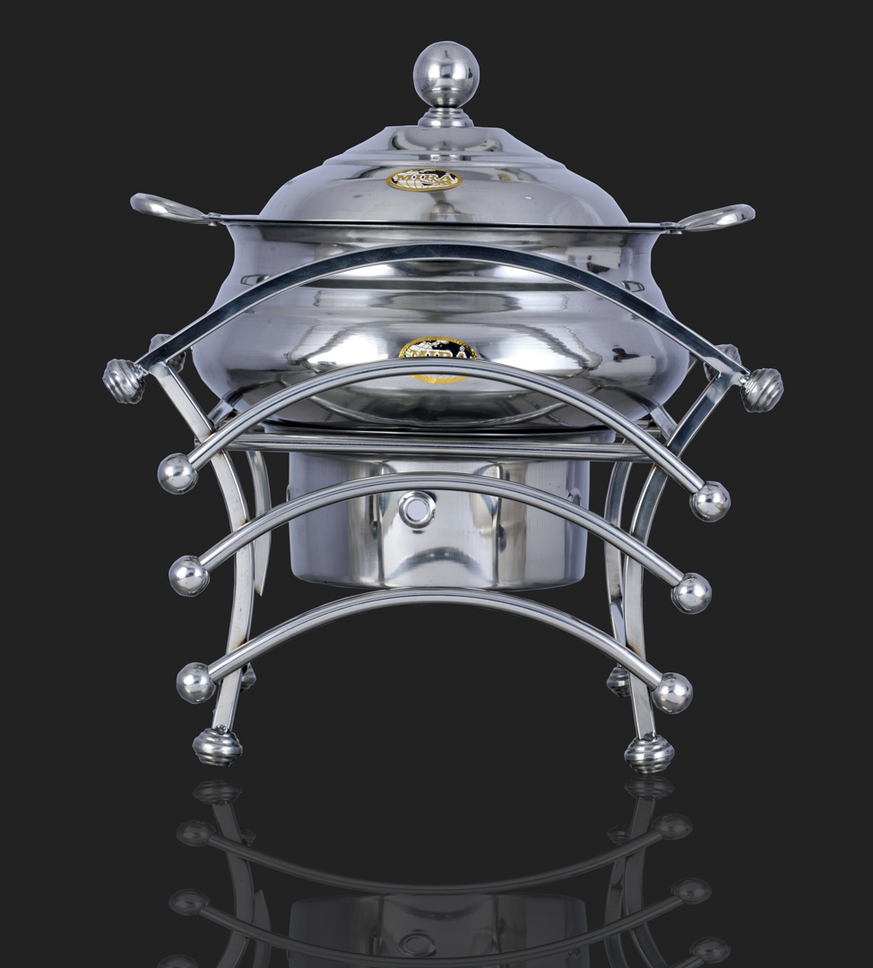 The stainless steel Rod Stand Jumbo food Chaffer is a durable and efficient kitchen equipment designed to display and serve food in style. Its spacious interior allows for a variety of dishes, from chapatis and parathas to vegetables and meats. The chaffer's sturdy construction ensures stability and longevity, making it a reliable addition to any commercial or home kitchen. The sleek stainless steel finish adds a touch of elegance to any food presentation.