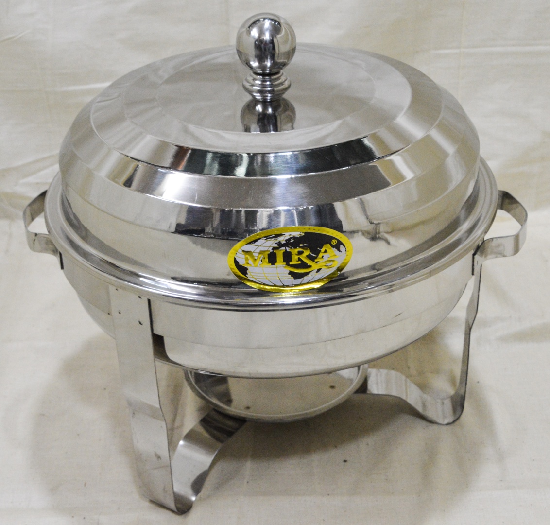 A stainless steel Round Bowl food Chaffer is a stylish and durable serving dish designed to keep food warm or cold.