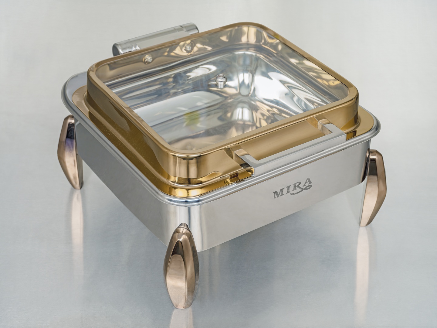The Square Hydraulic Glass-Lid Chafing Dish from Mira Steel is a premium buffet server designed with durability, elegance, and advanced functionality. Made with high-quality stainless steel and coated with a PVD finish, it offers superior resistance to corrosion and scratches while adding a luxurious touch to any buffet or catering event. The hydraulic roll-top lid allows smooth, noiseless operation, making it an excellent choice for hotels, restaurants, and catering services across global markets.