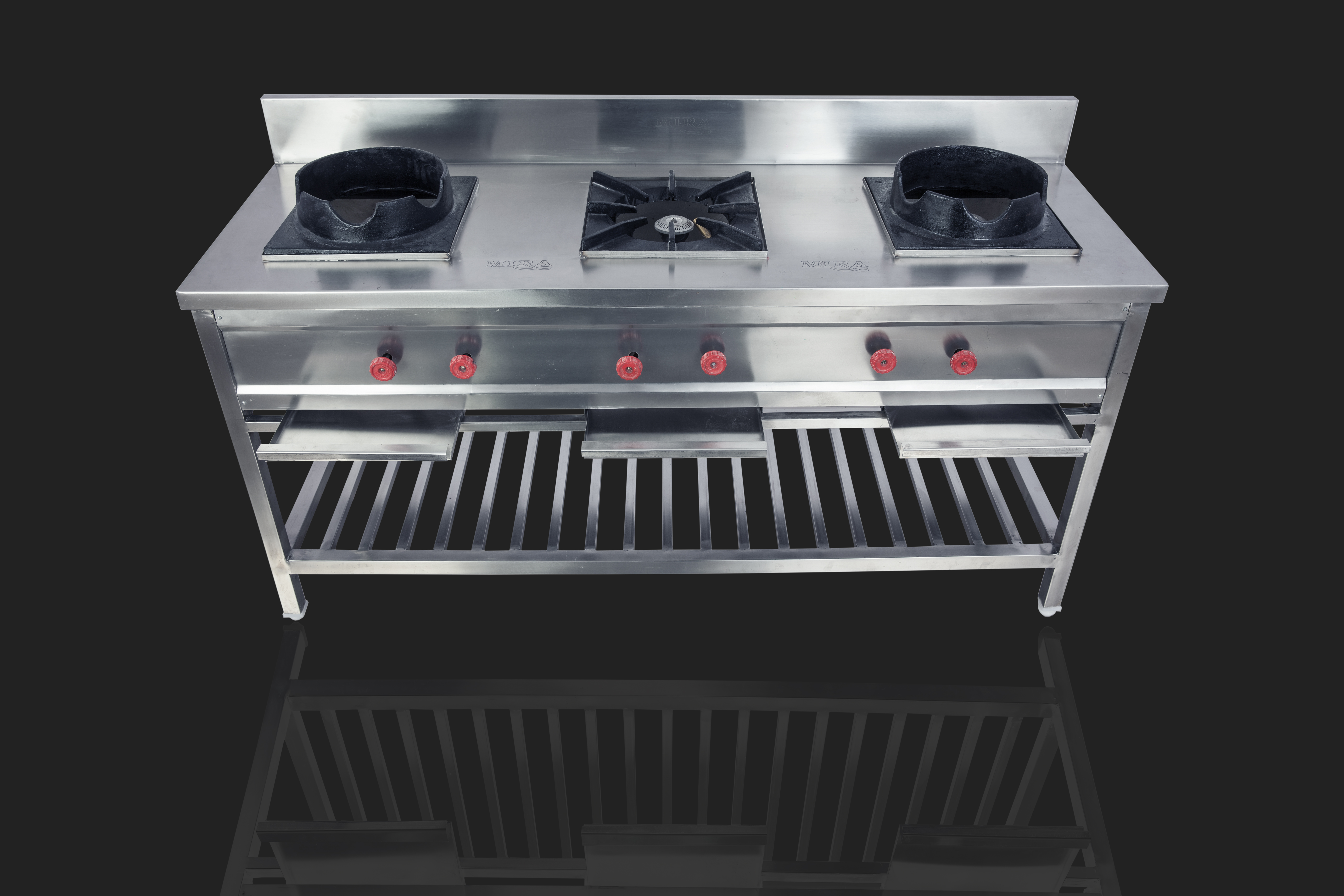 Equipped with three powerful high-efficiency burners, this cooking range allows you to prepare multiple dishes simultaneously, saving time and increasing kitchen productivity. The adjustable flame control provides precision cooking, while the sturdy cast iron pan supports handle heavy pots and pans with ease. The under-shelf storage adds extra convenience for kitchen tools and ingredients.