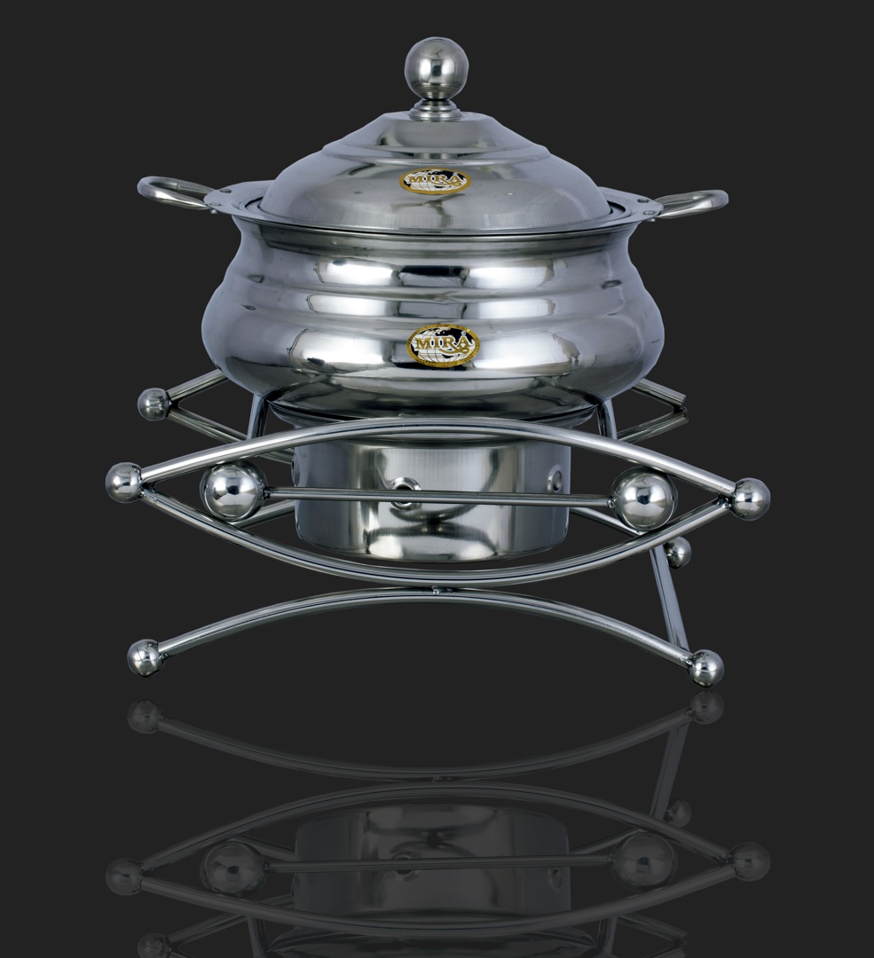 A stainless steel Two Line Jumbo Chaffer is a versatile and heavy-duty cooking equipment designed for commercial kitchens. It features two separate compartments for steaming and boiling various foods simultaneously. Its sturdy construction ensures long-lasting performance, while the stainless steel material makes it easy to clean and maintain.